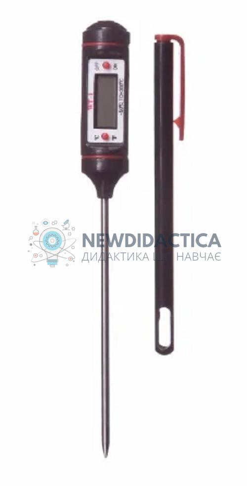 Електронний термометр для їжі призначений, в першу чергу, для вимірювання температури рідких, сипучих і напівтвердих продуктів. Характеристики: • Діапазон температур: -50 ºC до +300 ºC • Функції утримання поточного значення • Автовимкнення після 10 хв бездіяльності • Одиниці виміру: ºC, ºF • Дозвіл: 0,1 ºC / ºF • Довжина щупа: 110 мм • Похибка: ± 1 ºC / ºF • Час вимірювання: 2,0 сек. • Батарейка: 1,5 V (AG13) • Габарити / маса: 180 мм × 19 мм / 35 гр.