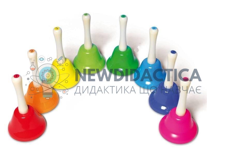 Барвисті металеві дзвіночки з дерев’яною ручкою, що відрізняються своїм чітким звучанням. Ці інструменти можуть бути успішно використані в індивідуальній чи груповій роботі. 8 осіб можуть використовувати один набір одночасно. Кожен звук має певний колір та номер, присвоєний йому. 8 діатонічних мелодій.
