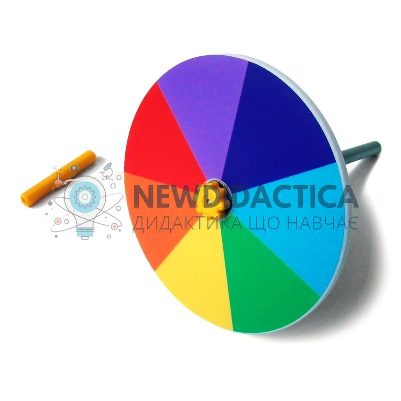 Диск Ньютона (ручний механічний привод). призначений для використання у загальноосвітніх та вищих навчальних закладах, в лабораторіях і кабінетах фізики, вчителем (викладачем) і учнями при виконанні лабораторних робітта робіт фізичного практикуму з оптики відповідно до чинних навчальних програм МОН України з фізики. До комплекту входить: диск діаметром 140 мм з еанесеними сегментами різного кольору (червоний, жовтий, зелений, блакитний, синій, фіолетовий); вісь -1 шт.; шків, щільно прикріплений до диска- 1 шт.; гайка - шт.; шнур, 1 м - 1 шт. Під час обертання диска, кольори змішуються у білий колір: диск одягнути на вісь і зафіксувати гайкою, шнур намотати на шків, різко потягнути за шнур та змусити диск обертатися.перетині променем світла лінзи окулярів навколо зображення по іншу сторону лінзи з'являються кольорові плями. Виникнення цих плям викликано розкладанням світла, званим дисперсією. Крім того, він переконався, що при проходженні променя світла через призму білий колір розкладається на кілька різнокольорових променів, що утворюють сонячний спектр. Виходячи з цього досвіду, він зробив висновок, що якщо білий колір можна розкласти на кольори веселки, то можна зробити і зворотну маніпуляцію - отримати білий колір з декількох променів різних кольорів. При обертанні диска Ньютона (ручний привод) вдалося наочно продемонструвати свою теорію. Диск розділений на сектори кольорів видимого спектру. При обертанні його з високою швидкістю Ви можете спостерігати, як ці кольори зливаються, утворюючи білий тон, що перевершує по яскравості кожен з кольорів окремо. Цей простий експеримент є одночасно пізнавальним, так як він: демонструє процес злиття кольорів веселки в білий колір; демонструє склад білого кольору.