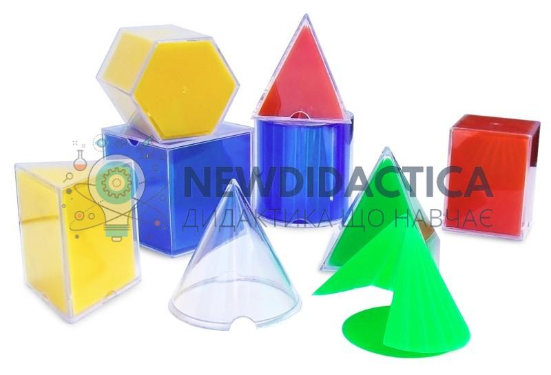 Геометричні тіла з розгорткою виготовленіз прозорого некрихкого матеріалу. Всерединікожної фігури розміщується площинна геометрична розгортка даної фігури, виготовлена з кольорового некрихкого матеріалу. Висота кожної фігури має бути не менше 8,0 см, що дозволяє розрізняти її елементи з відстані не менше 5см. Габаритні розміри набору в упаковці 30х32х8 см. Вага - не більше 1 кг. Склад: - геометричні фігури – 8 од.; - коробка для зберігання набору – 1 од.; - паспорт на виріб - 1 од.