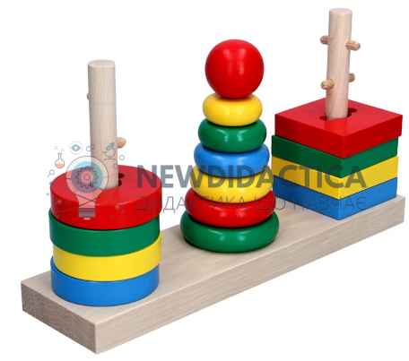 Завдання дитини правильно підібрати до основи зі стрижнями різні фігурні деталі, що співвідносяться за формами, розташувати їх за зменшенням розміру. Таке заняття вимагає кмітливості та спритності. У процесі гри розвиваються пальчики і руки, вміння мислити логічно, зіставляти, сортувати, запам'ятовуються основні кольори. Дерев'яна іграшка знайомить з азами геометрії, допомагає освоїти поняття більше-менше. Взаємодія з натуральним матеріалом – деревом, тренує дотик, вчить співвідносити розмір деталі з її вагою.