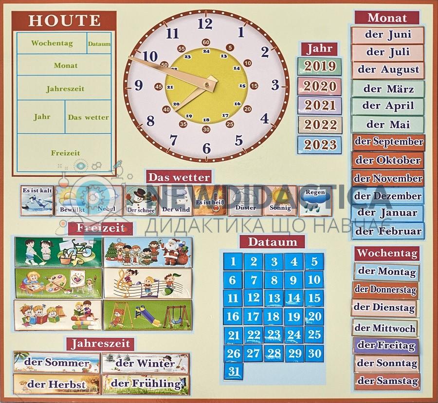 Магнітний календар використовується в якості демонстраційного матеріалу під час вивчення німецької мови в початкових класах. Стрілки годинника – рухомі. Виготовлений з нетоксичного високоякісного пластику. Розмір: 61 х 61 х 0,2 см.
