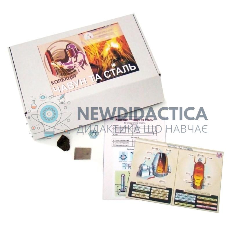Використовується колекція «Чавун і сталь» в кабінеті хімії загальноосвітнього навчального закладу під час вивчення курсу неорганічної хімії. Колекція застосовується для ознайомлення учнів з процесами підготовки і виробництва чавуну та сталі. Колекція містить зразки: магнітного залізняку, червоного залізняку, бурогозалізняку, коксу, вапняку, шлаку, феромарганцю, ферохрому, сталі (нержавіючої, тонколистової, конструкційної, оцинкованої), вироби з чавуну, вироби з сталі з покриттям. До колекції входить ламінована вкладка, що містить інформацію про виробництво і використання чавуну і сталі. Можливий інший склад колекції.