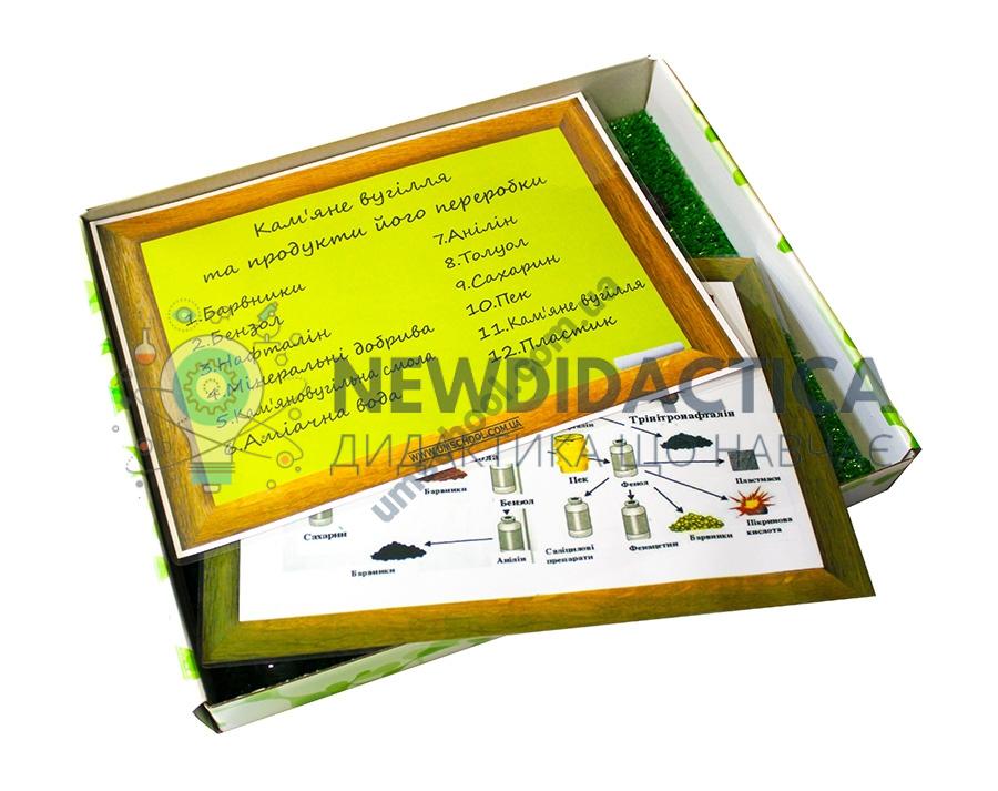 Категорія згідно переліку МОН: демонстраційне обладнання. Об’єкти натуральні. Призначення: для використання в загальноосвітніх навчальних закладах на уроках хімії, географії та природознавства як демонстраційного обладнання при вивчені відповідних тем. Опис: колекція містить зразки об’єктів із супровідним описом (переліком). Кількість - не менше 12 зразків об’єктів . Склад колекції: - барвники - 1 од.; - бензол - 1 од.; - нафталін - 1 од.; - мінеральні добрива - 1 од.; - кам'яновугільна смола - 1 од.; - аміачна вода - 1 од.; - анілін - 1 од.; - толуол - 1 од.; - сахарин - 1 од.; - пек - 1 од.; - кам'яне вугілля - 1 од.; - пластик - 1 од.; - паспорт на виріб - 1 од. Горючі, вибухові та отруйні речовини імітовані. Зразки містяться у герметичних пластикових ємностях.