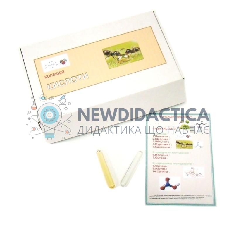 Використовується колекція «Кислоти» в кабінеті хімії загальноосвітнього навчального закладу. Колекція містить зразки основних кислот, що широко використовуються у виробництві. Склад колекції: оцтова кислота; мурашина кислота; пальмітинова кислота; олеїнова кислота; амінооцтова кислота (гліцин); бурштинова кислота; винна кислота; щавлева кислота; нітратна кислота (азотна кислота); борна кислота.