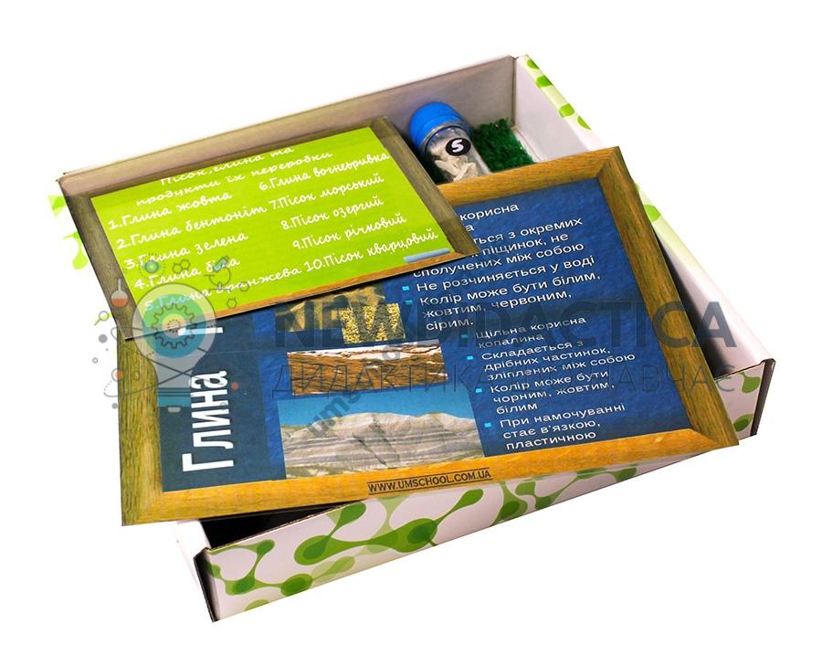 Використовується в загальноосвітніх навчальних закладах на уроках географії та природознавства як демонстраційного обладнання при вивчені відповідних тем. Колекція містить зразки об’єктів із супровідним описом (переліком). Кількість - не менше 12 зразків об’єктів. Габаритні розміри: не більше 35х25х4 см. Вага не більше 1 кг.