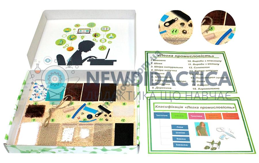 Використовується колекція в загальноосвітніх навчальних закладах на уроках хімії, географії, трудового навчання та природознавства, при вивченні відповідних розділів підручника. У колекції представлені деякі зразки сировини для легкої промисловості та вироби з них. Розмір упаковки: не більше 320х230х90 мм. Вага: не більше 2,0 кг.