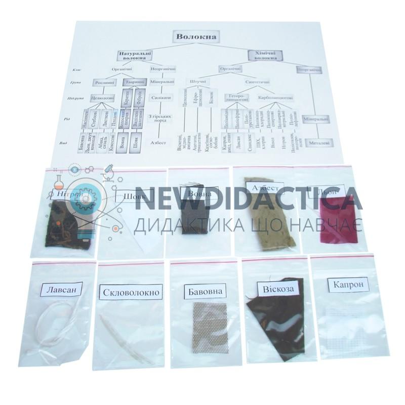 Склад: зразки натуральних волокон: льон, бавовна , вовна, шовк; зразки натуральних волокон: азбест, скловолокно; зразки натуральних волокон: капрон, лавсан, нітрон, віскоза; зразки тканин виготовлених з перерахованих вище волокон; ламінована вкладка, що містить інформацію про властивості волокон. Колекція застосовується для демонстрації зовнішнього вигляду волокон і під час проведення демонстраційних дослідів, за визначенням фізичних та хімічних властивостей волокон різних типів.