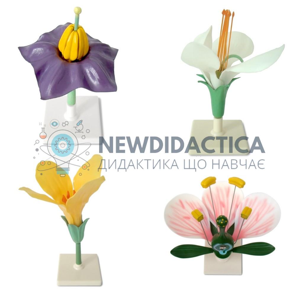 Використовується набір моделей «Квітки представників різних родин» в кабінеті біології загальноосвітнього навчального закладу під час вивчення теми «Рослини». Набір складається з квітки яблуні, квітки картоплі, квітки гороху, квітки капусти. Моделі квіток є розбірними, що дає можливість демонструвати будову та відмінність квіток різних родин. Виготовлені з пластику, забарвлені в природні кольори та встановлені на підставки. Розміри моделей приблизно 20...30 см.
