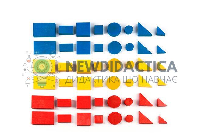 Використовується вчителем як роздатковий матеріал під час вивчення математики. Технічні характеристики: Логічні блоки Дьєнеша - це навчально-методичний посібник для ознайомлення дітей з геометричними фігурами і формою предметів. Розвиває вміння порівнювати, аналізувати, класифікувати, узагальнювати; формує пізнавальні процеси, пам'ять, увагу, логічне мислення. До набору входять таки фігури: квадрат, прямокутник, коло, трикутник, шестикутник. Фігури виконані в трьох кольорах: червоний, жовтий, синій. Мають товщину: 5 мм. Кожен комплект має бути упакований в пластикову коробку для зберігання.
