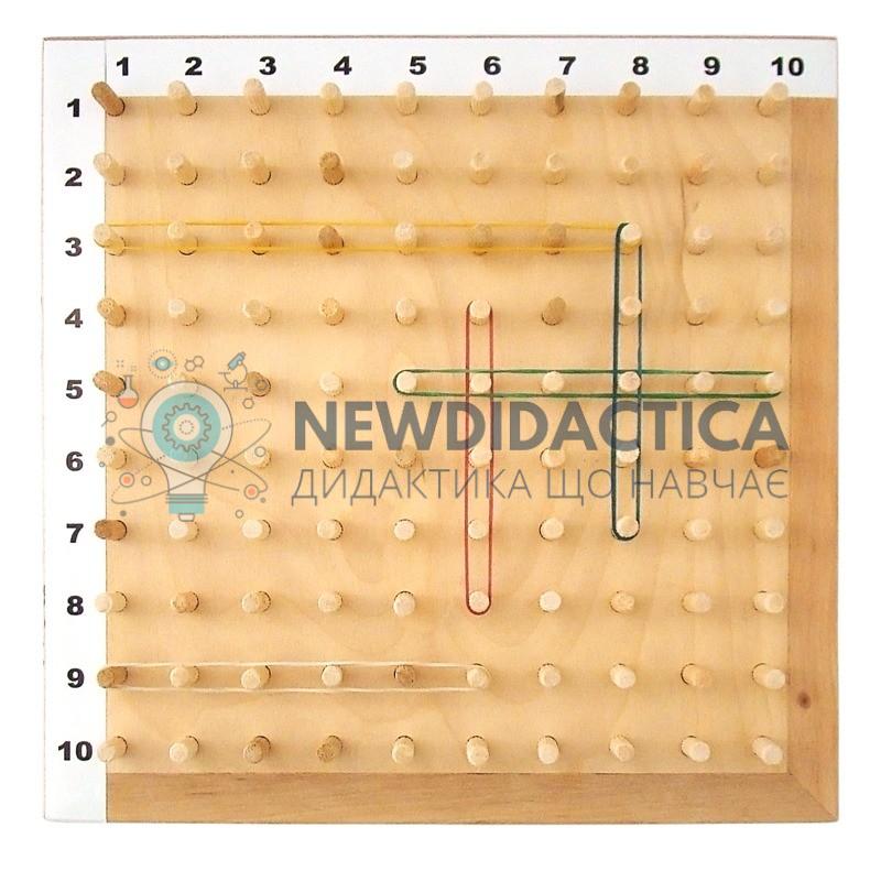 Використовується в початкових класах загальноосвітнього навчального закладу. Математичний планшет (геоборд) – це багатофункціональна геометрична дошка для конструювання плоских зображень. Геоборд розвиває когнітивні здібності дитини: просторове і асоціативне мислення, увагу, пам’ять, сприяє психосенсомоторному розвитку та розвиває дрібну моторику, дозволяє самостійного вигадувати зображення, розвиває фантазію і творчий потенціал дітей. В процесі гри з геобордом дитина засвоює такі непрості геометричні поняття, як форма, розмір, симетрія, вчиться робити лабіринти, «писати» гумками своє ім’я, відпрацьовує навички рахування і т.д. Також, це відмінний метод розслаблення і зняття фізичного та психологічного напруження у дітей. Математичний планшет повинен являти собою платформу з штирями, які рівовіддалено розташовані один від одного по горизонталі та вертикалі. Габаритні розміри геоборду: не менше 30 х 30 х 4 см. Вага 0,7 кг. Матеріал – високоякісне оброблене дерево.