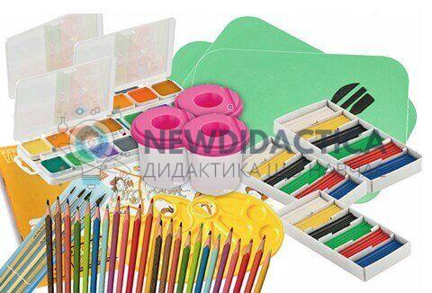 Технічні характеристики: Набір містить наступні матеріали для використання на уроках образотворчого мистецтва і розрахований на роботу в групах від 3 до 6 учнів. Один набір включає в себе не менше 18 найменувань: 1. клей ПВА не менше 50мл. - не менше 3од.; 2. ножиці з закругленими кінцями - 3од.; 3. дошка для пластиліну з 3-ма стеками для роботи. - 6од.; 4. пластилін дитячий: не менше 6 кольорів, 200г. - 3од.; 5. кольоровий папір (упаковка) - 2од.; 6. фарби акварельні: не менше 6 кольорів - 3од.; 7. пензлі для малювання: круглі - 6од.; 8. гумки для стирання графітного олівця - 3од.; 9. лінійка, 20см., з трафаретом геометричних фігур - 6од.; 10. трафарети тварини, фрукти, овочі, птахи, риби - 6од.; 11. кольоровий картон (упаковка) - 2од.; 12. альбом для малювання - 6од.; 13. склянка: одинарна непроливна пластикова - 3од.; 14. кольорові олівці: не менше 12 кольорів - 2 од.; 15. олівці графітні,без гумки. - 6од.; 16. палітра класична: пластикова для малювання - 3од.; 17. стругачка пластикова - 3од.; 18. кольорова скриня з прозорою кришкою - 1од.
