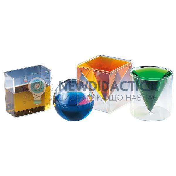 Набір для знайомства з поняттям обсягу містить 6 різних геометричних фігур: прямокутник, куб, циліндр, сферу, піраміду і конус. Відкрите дно фігур для додавання води або піску. Кожна модель упакована в поліетиленовий пакет, а потім у пластиковий контейнер. Розмір деталей, см10х5, 10х10, d10