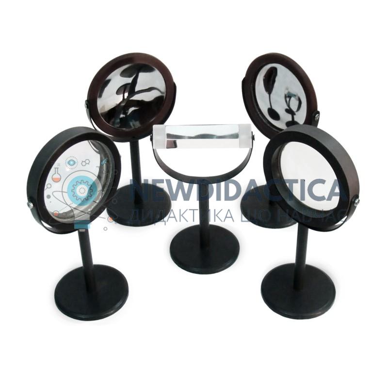 Використовується набір лінз та дзеркал з призмою в кабінеті фізики загальноосвітнього навчального закладу під час проведення демонстраційних дослідів з оптики. Всі елементи набору виготовлені з високоякісного оптичного скла. Оптичні елементи розміщені на штативах. Габаритні розміри одного елемента набору: 25х15х15 см Вага набору: 1,2 кг.