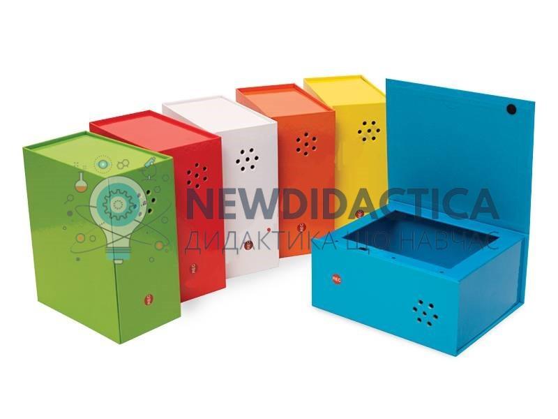 В коробки вбудований мікрофон, що дозволяє зареєструвати 10-секундне повідомлення, яке відтворюється автоматично під час підняття кришки. Коробки виготовлені з міцного картону, поверхня якого дозволяє писати маркером. Набір ідеально підходить для логопедії, навчання соціальним навичкам або для вивчення іноземних мов. Склад: 6 коробок білого, жовтого, помаранчевого, червоного, зеленого, синього кольорів.