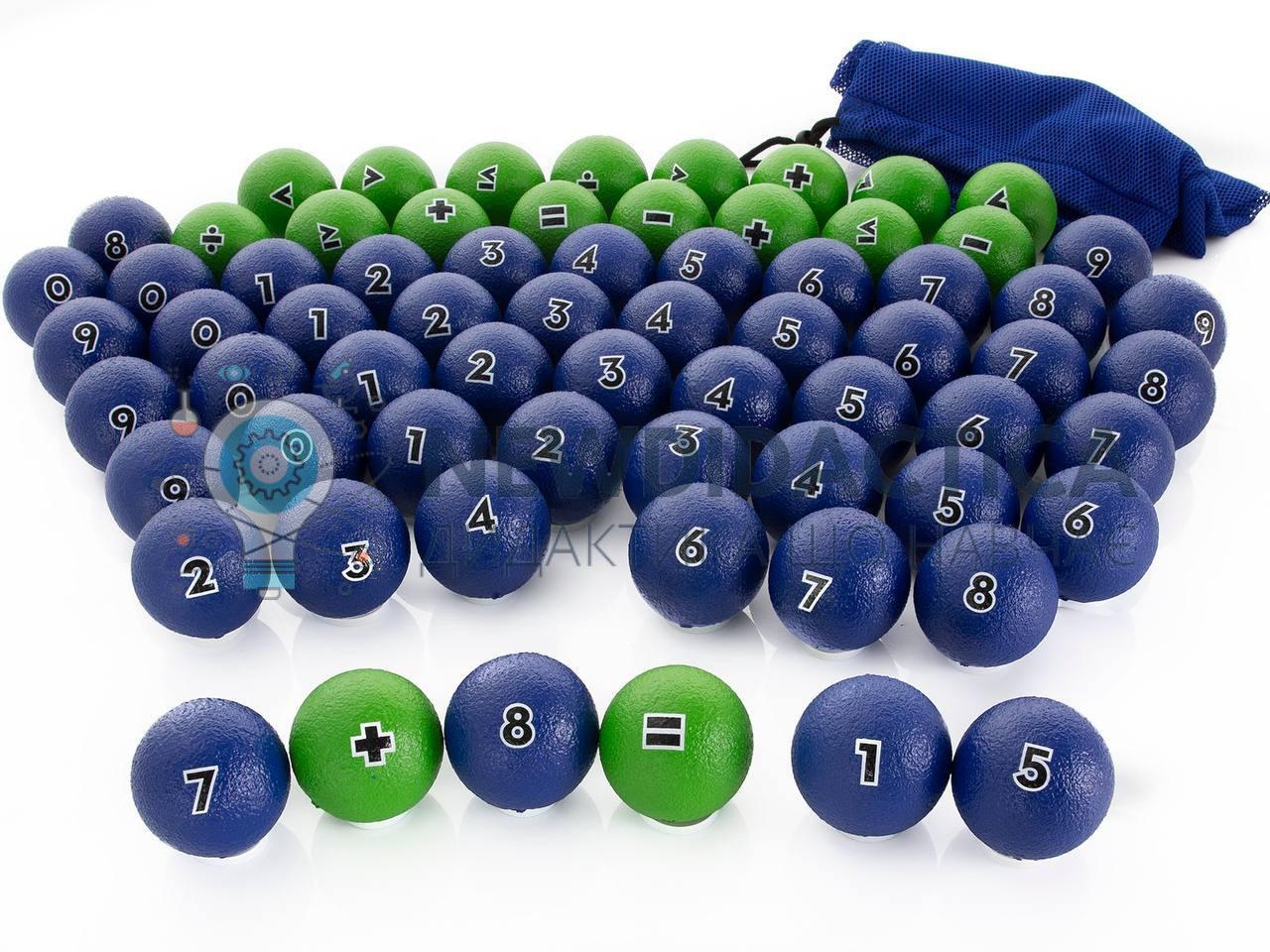Кольорові кульки позначені цифрою або математичною операцією, що слугує частинами рівняння, яке учні створюватимуть на льоту. Для початку поставте кулі на 25 см від стартової лінії, де вишиковуються команди учнів. За сигналом команди поспішають захопити номер, операцію та інший номер. Як тільки рівняння команди буде завершено, вони співпрацюють, щоб вирішити його першим! Здобувачі освіти вивчать додавання, віднімання, ділення та багато іншого під час цього уроку кінетичної математики, який залишає звичайні таблиці множення позаду. Міцні пінопластові кульки із середнім відскоком мають поліуретанові покриття і мають діаметр не менше 5 см. Методичні матеріали, що входить до комплекту, можна використовувати для 4 класів та 5-8. Набір включає 50 синіх цифрових кульок (5 шт. 0-9), 18 зелених кульок для операцій (символ 2 шт.), Мішок для зберігання (36 Д х 24Ш) та методичні матеріали для занать.Рекомендовано для початкових та старших класів.Кульки з символами:Додавання Віднімання Множення Ділення, Більше, Менше.
