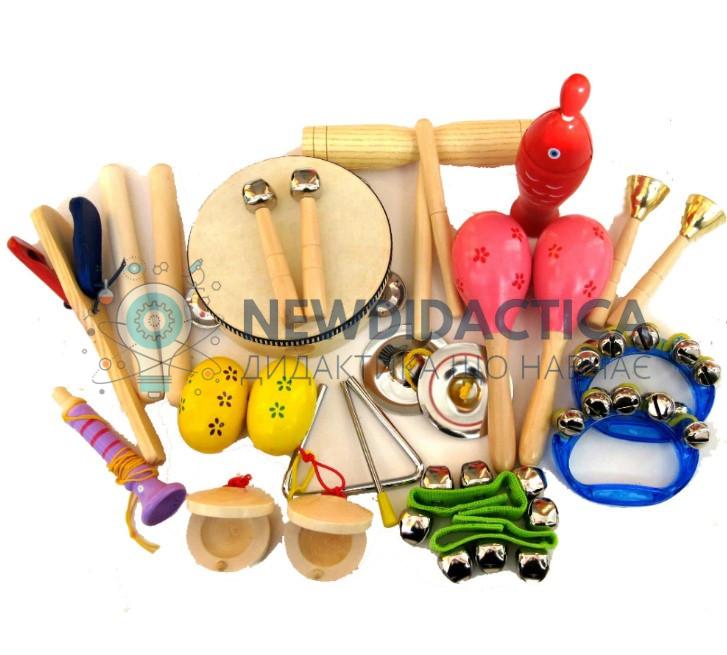 Технічні характеристики: Набір містить не менше 25 предметів: 1. дзвіночок з тримачем - 2шт.; 2. сталевий трикутник з паличкою - 1шт.; 3. шейкер - 2шт.; 4. тріскачка дерев’яна - 2шт.; 5. блок-флейта - 1шт.; 6. дзвіночки півколо - 1шт.; 7. маракас пластиковий з ручною - 2шт.; 8. бубен з ручкою - 1шт.; 9. тамбурин - 1шт.; 10. губна гармоніка - 1шт.; 11. ксилофон (на 7 нот, з паличками) - 1шт.; 12. пара дерев’яних клавес - 1шт.; 13. дзвіночки на ручці - 1шт., 14. тон-блок з паличкою - 1шт.; 15. дзвіночки на браслеті - 2шт.; 16. сопілки дерев’яні (не менше 32 см) - 4шт.; 17. пластиковий кольоровий контейнер з кришкою для зберігання та транспортування - 1шт. Всі інструменти виготовлено з деревини, металу та первинного поліпропілену.