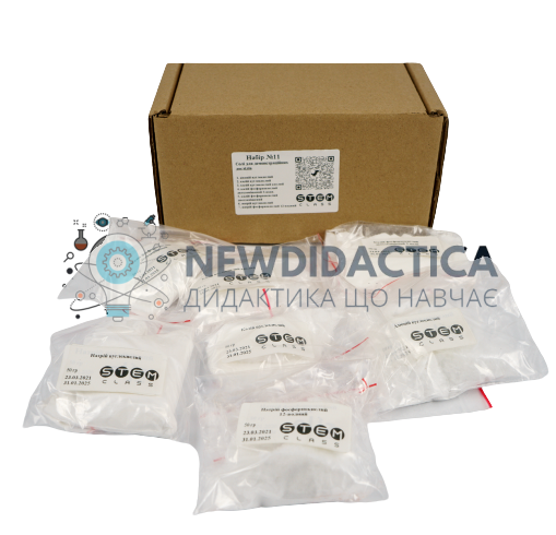 Використовується набір №11 С «Солі для демонстраційних дослідів» в кабінеті хімії загальноосвітнього навчального закладу під час проведення демонстраційних дослідів.Буквені позначення:В - для основної загальноосвітньої школи;С - для середньої (повної) школи;ВС - для основної та середньої (повної) школи.Повний комплект забезпечує можливість проведення демонстраційних і лабораторних дослідів відповідно до програми та задовольняє річну потребу для одного кабінету хімії. Є набором дрібно фасованих реактивів (вказано в кілограмах), кваліфікації "чисті" і "технічні".Склад набору:амоній вуглекислий (ч) – 0,05 кг;алій вуглекислий (ч) – 0,05 кг;калій вуглекислий кислий (ч) – 0,05 кг;калій фосфорнокислий двохзаміщений 3-водн, (ч) – 0,05 кг;калій фосфорнокислий двохзаміщений (ч) – 0,05 кг;натрій вуглекислий (ч) – 0,05 кг;натрій фосфорнокислий 12-водний (ч) – 0,05 кг.