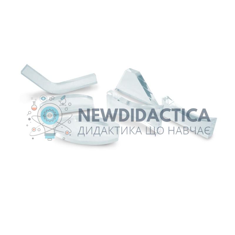 Використовується набір призм в кабінеті фізики загальноосвітнього навчального закладу під час проведення демонстраційних дослідів з геометричної оптики. Прилад дозволяє спостерігати прямолінійне поширення світла, відбиття променя, переломлення променя в скляній призмі, дослідити принцип будови перископа. Виробник може змінювати склад набору. Вага: 0,34 кг.