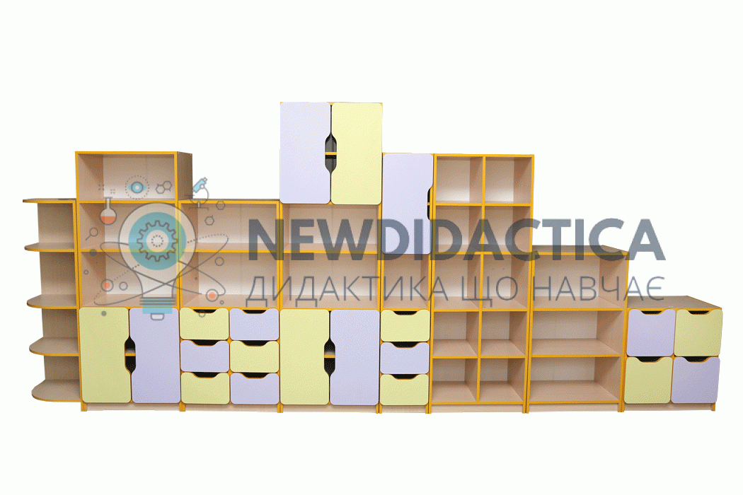 Стінка універсальна "Школа-Сад" Габаритні розміри: 4310х410х1885 мм. Вага: 280,50 кг. Виготовлена з ДСП: фасади 18 мм та корпус 16 мм. Стінка призначена для умеблювання садочків та молодшої школи, можлива різнопланова комбінація елементів, є функціональною та призначена для зберігання дидактичного матеріалу, книг, папок, особистих речей дітей. Оклейка: ПВХ жовтого кольору товщиною 1 мм. КомбінаціЇ кольорів: Колір корпусу: бук, колір фасаду: жовтий/лайм. Колір корпусу: дуб молочний, колір фасаду: жасмін/лаванда.