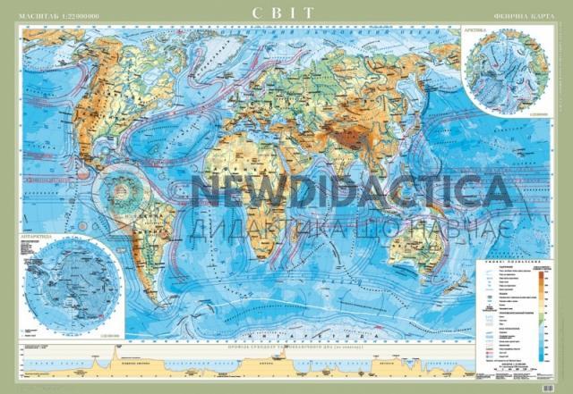 Опис товару: Фізична карта світу на планках Без великої фізичної карти світу неможливо уявити жоден шкільний кабінет географії — це одна з географічних карт, які найчастіше використовуються у навчальному процесі. Тому так важливо придбати якісну карту, що збереже чудовий вигляд і чіткість зображення навіть після років активного використання на уроках у молодшій, середній і старшій школі. Особливості карти світу Даний варіант фізичної карти світу має наступні особливості: надійні пластикові планки для кращого кріплення; великий розмір — 158х108; детальний масштаб 1:22 000 000.