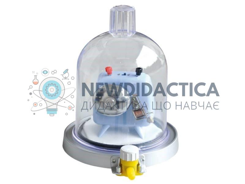 Вакуумна тарілка з дзвінком використовується в кабінеті фізики та призначена для демонстрації дослідів у замкнутому об’ємі з розрідженим повітрям. Прилад використовується з вакуумним насосом. Дозволяє провести наступні демонстрації: необхідність пружного середовища для поширення звукових коливань; будова і дія манометра та барометра-анероїда; залежність температури кипіння рідини від тиску; спостереження за гумовою кулькою під дзвоном (пластиковим прозорим ковпаком), тощо. Прилад складається із основи, виконаної у вигляді пластмасового диска (тарілки) на ніжках, з патрубком та краном для відкачування повітря, ковпака з пластмаси, гумової прокладки і електричного дзвоника. Технічні характеристики: Габаритні розміри: 19х20х30 см; Вага приладу: 1,3 кг. Напруга живлення дзвоника: 3-6 В. Комплектація: основа (тарілка) - 1 шт; пластиковий дзвін-ковпак - 1 шт; дзвінок електричний - 1 шт; Джерело живлення електричного дзвоника до комплекту не входить.