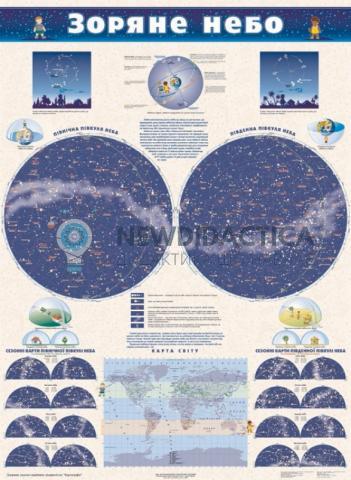 Опис товару: Навчальна карта зоряного неба для уроків географії Карта північної та південної півкуль зоряного неба для вивчення на уроках географії та астрономії. Особливості карти З допомогою карти можна детально дослідити: сезонні карти північної півкулі неба; сезонні карти південної півкулі неба. А ще — ознайомитися з такими важливими поняттями як небесна сфера, небесні координати, небесний екватор тощо. Розмір карти 152х108.