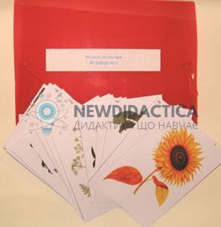 Використовується модель-аплікація «Агроценоз» в кабінеті біології загальноосвітнього навчального закладу під час вивчення розділу «Загальна біологія». Модель-аплікація містить 23 картки, що демонструють культурні та дикорослі рослини, диких і свійських тварин, а також картка із зображеням працівників, що займаються аграрною працею. Деякі представники флори та фауни відносяться до складу агроценозів, а інші відносяться до природних біоценозів і наведені для порівняння. Всі картки ламіновані та оснащені магнітним кріпленням, що дозволяє демонструвати посібник на металевій класній дошці без застосування додаткового кріплення.