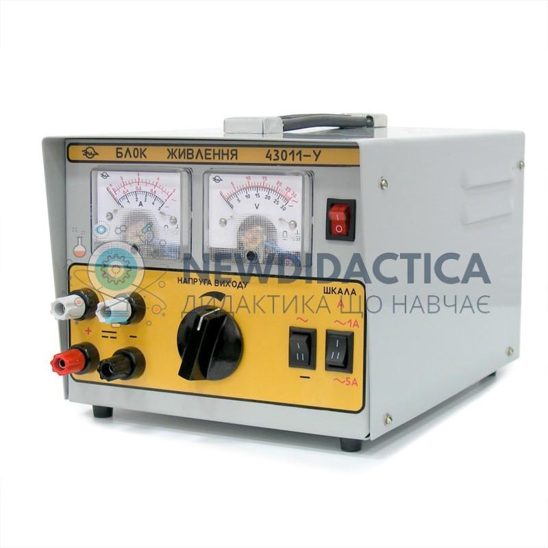 Блок живлення 43011-У призначений для використання в навчальних закладах викладачем для живлення різних навчальних приладів і установок струмом постійної чи змінної напруги. Живлення блока здійснюється від мережі змінного струму частотою 50 ± 1 Гц, напругою 220 В ± 10%. Споживана потужність при номінальному навантаженні не більше 110 ВА. Вихідні напруги: змінна нестабілізована – від 2,5 до 27 В ± 10/15% з кроком близько 2,5 В; постійна нестабілізована – від 2 до 24 В ± 10/15% з кроком близько 2 В.