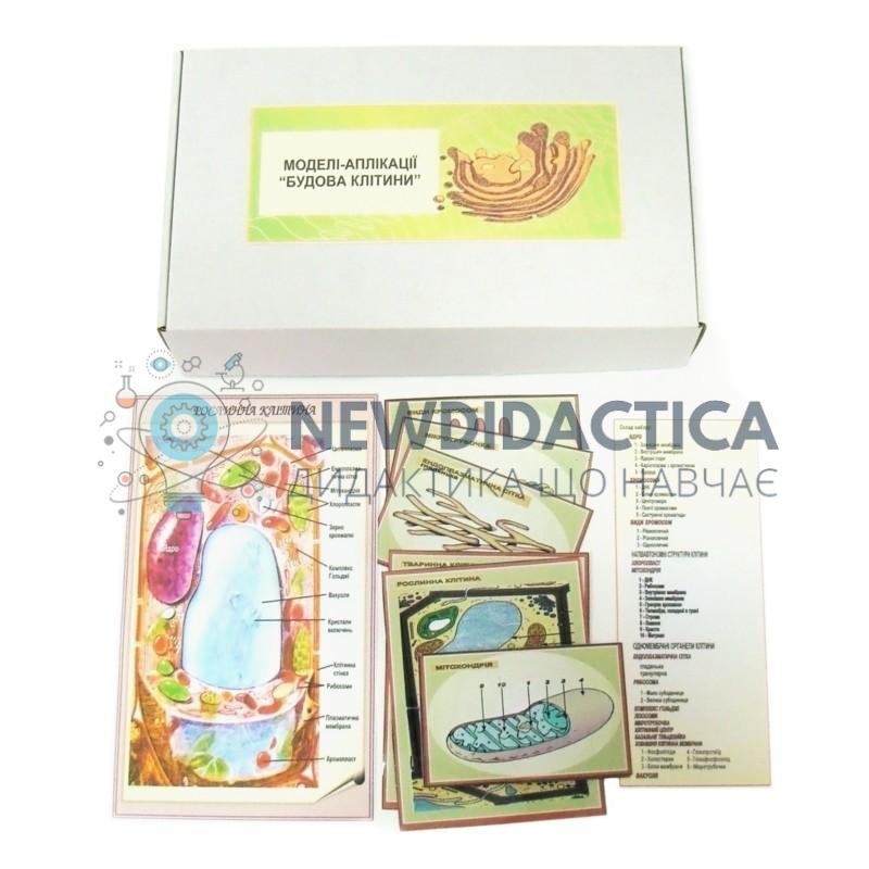 Використовується Модель-аплікація «Будова клітини» в кабінеті біології загальноосвітнього навчального закладу під час вивчення розділу «Загальна біологія», тем «Генетика» та «Цитологія». Модель-аплікація містить 19 карток з зображенням різноманітних структур та органоїдів клітини. Картки ламіновані та оснащені магнітним кріпленням, що дозволяє демонструвати посібник на металевій класній дошці без застосування додаткового кріплення.