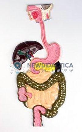 Використовується барельєфна модель «Будова травної системи людини» в кабінеті біології загальноосвітнього навчального закладу під час вивчення розділу «Людина». Модель демонструє травну систему людини, що дозволяє учням ознайомитись з анатомічною будовою всієї травної системи: ротовою порожниною, стравоходом, шлунком, печінкою з жовчним міхуром, тонким та товстим кишковиком. Виготовлена з листового термопластика з глибиною рельєфу до 3 см. Зображення забарвлено в природні кольори. Розміри моделі 60x40 см.