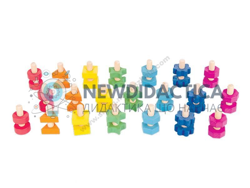 Тверді гайки та болти з деревини бука різних форм та кольорів.Кожна гайка має відповідний болт.Усі фігури мають різну кількість країв, збільшуючись від 1 до 8. Розміри кожного елемента підходять для маленьких дітей.Набір ідеально підходить для вивчення розрізнення кольорів та розпізнавання фігур, раннього підрахунку, а також для розвитку ручної спритності, спритності та точності рук і пальців.Все було поміщено в бавовняний мішок. 21 шт. тьмяний6,5 см;матеріал: дерево;вік: 12 місяців +