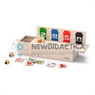 Дерев'яний ігровий набір " Сортування сміття" – корисна забава для всієї родини! Продумана гра на тему збереження екології створена для дітей дошкільного віку від 3 років. Дерев'яна іграшка містить ящик із кришкою, прямокутну планку, 50 квадратних плиток, 2 гральні кубики, інструкцію. Зіставлення, сортування, класифікація предметів, координація рук і очей – це ті корисні навички, які діти легко набувають із цією захопливою грою. Дерев'яна розвиваюча іграшка для освоєння повсякденного сортування відходів підвищує екологічну свідомість дітей. Це чудова розвиваюча іграшка для дому та навчальний набір для дитячих садків і початкової школи. На 50 дерев'яних плитках зображені продукти харчування і предмети домашнього вжитку. Прямокутна дерев'яна коробка з 4 отворами в кришці також зручна для зберігання та перенесення комплекту. У наборі два гральні кубики з кольоровими точками для різних способів гри, а також інструкція з правилами. Розберемо найпростіший спосіб грати. Над ящиком поставте планку із зображенням кольорових сміттєвих баків для різних відходів. У щілини коробки необхідно проштовхувати плитки з різними картинками. Їх сортують за логікою. Потім дістають із секцій ящика і звіряють: колір на звороті плитки повинен збігатися з кольором намальованого бака. Можна грати одному гравцеві або в команді з друзями, є кілька способів. Також це хороша інтерактивна гра для батьків і дітей. Дерев'яний ігровий набір переміг на Tillywig 2020 Best Family Fun в номінації кращий продукт для сімейного дозвілля і спільної гри.