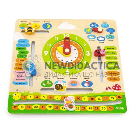 Пізнання світу разом із дерев'яним календарем із годинником на англійській мові від Viga Toys стане розвивальною грою, завдяки якій дитина познайомиться з поняттями час і погода. Навчальна іграшка захопить малюків дошкільного віку від 3 років. Переставляючи бігунки у вигляді казкових комах і птахів по місяцях, днях тижня і датах, діти розвивають інтелект і стають більш спостережливими. Рухомі стрілки на годиннику допоможуть навчитися визначати, котра година. Є також шкали з назвами сезонів, погоди і часом доби. Розвивальна гра з навчальним календарем тренує мислення, зокрема просторове і логічне, розширює кругозір. Годинник-календар відповідає концепції НУШ. Набір для вивчення часу також підходить для розвитку за методикою Монтессорі. Щодня діти зможуть спостерігати за навколишнім світом і краще дізнаватися його за допомогою комплекту. Набір для навчання представлений англійською, і дитина зможе вивчити назви місяців, днів тижня, сезонів, погоди і часу доби найважливішою міжнародною мовою. Навчальна панель підходить для англійських уроків як наочний матеріал. Квадратну навчальну дошку 30 см можна повісити на стіну або розмістити на столі. Дерев'яний календар із годинником відшліфований і покритий гіпоалергенною фарбою, щоб дитина комфортно грала і вчилася. Навчальний набір відповідає стандартам безпеки та якості дитячих іграшок EN71, ASTM.