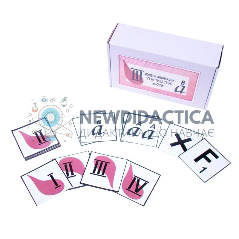 Використовується модель-аплікація «Генетика груп крові» в кабінеті біології загальноосвітнього навчального закладу під час вивчення розділу «Загальна біологія», тем «Цитологія» та «Основи генетики». Модель-аплікація містить 34 картки з зображенням груп крові, відповідних їм генотипів, гамет, знаків схрещування. Всі картки ламіновані та оснащені магнітним кріпленням, що дозволяє демонструвати посібник на металевій класній дошці без застосування додаткового кріплення.