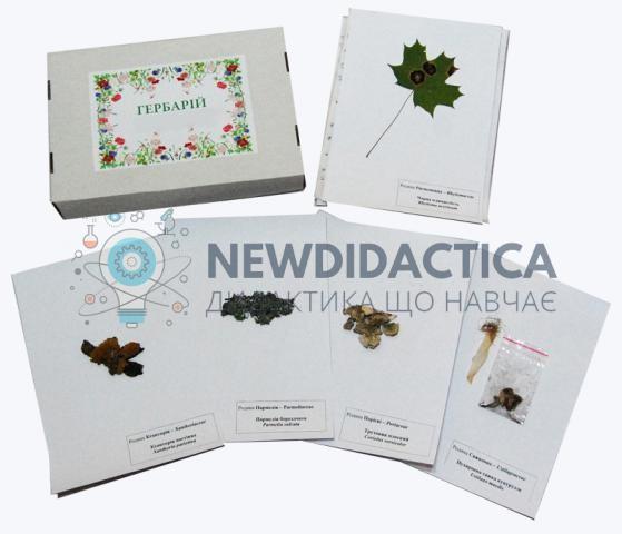 Категорія згідно переліку МОН: обладнання для лабораторних робіт.Призначення: для використання в загальноосвітніх навчальних закладах на уроках біології та природознавства для колективної та самостійної роботи учнів при вивчені відповідних тем.Опис: гербарні зразки висушені, прикріплені до гербарних листів формату А4. Кожен гербарний зразок супроводжується інформацією про родинну та видову назви. Кількість - не менше 10 гербарних зразків. Склад:- зелені водорості Ульва – 1 од.;- бурі водорості Ламінарія -1 од.;- бурі водорості Фукус – 1 од.;- гриби – 1 од.;- лишайник Пармелія зморшкувата 1од.; - лишайник Лишайник ісландський – 1 од.;- лишайник Оленій мох – 1 од.;- лишайник Листуватий лишайник – 1 од.; - лишайник Кладонія бахромчата – 1 од.;- лишайник Дубовий мох – 1 од.;- паспорт на виріб - 1 од.