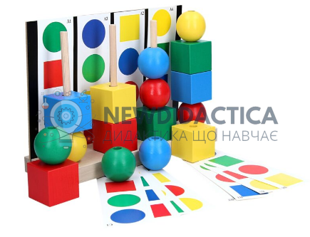 Набір містить основу зі стрижнями, картки з завданнями та об’ємні фігури великого розміру (кубик 4х4х4 см, кулька 4 см).