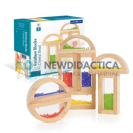 Пригода в кольорі, світлі та звуці! Сенсорний ігровий набір спонукає до досліджень. Комбінуйте блоки, щоб створити нові поєднання кольорів і звуків. Складайте блоки в різному порядку для створення незвичайних форм. Набір із будівельних блоків у вигляді геометричних фігур із рамами з масиву дерева і прозорими пластиковими віконцями з кольоровими намистинами всередині. Вісім блоків у комплекті: 4 прямокутника і 4 півкола (півмісяця). Розміри блоків: 14х7х3,5 см. Розвиток: координація рук і очей, зорове і слухове сприйняття, вивчення кольорів.