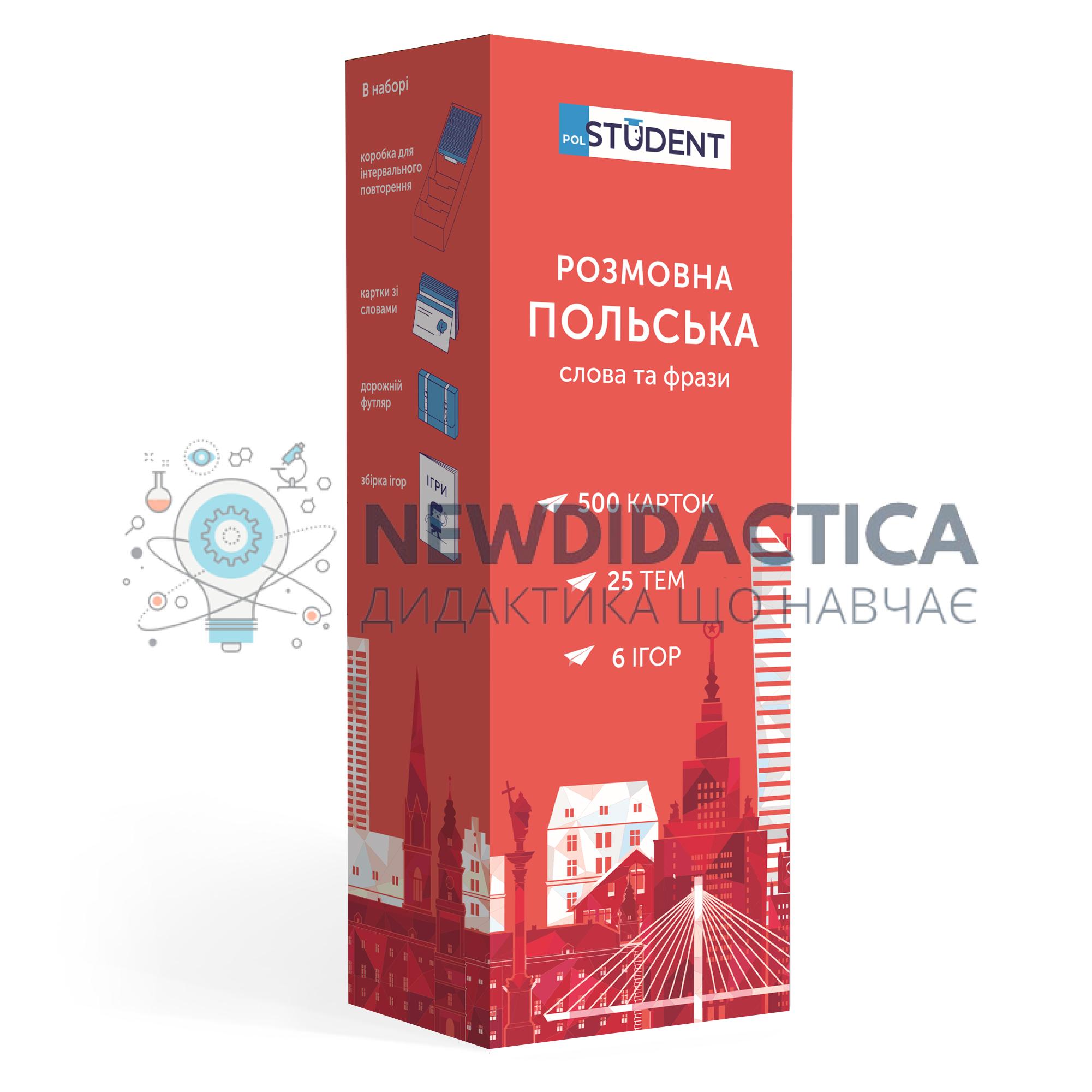 Вивчаєш польську мову і хочеш нарешті почати розмовляти, читати книги та дивитись фільми без субтитрів? Мрієш розуміти все, про що говорять і не шукати кожне слово у словнику? А чи знаєш ти, що картки - один із найефективніших методів збільшення словникового запасу. Обирай набір карток “Розмовна польська” від видавництва English Student - розмовляй польською впевнено! 5 причин обрати картки від English Student: Вивчай! Нові слова відповідно до свого рівня та середовища застосування Запам’ятовуй! 95% інформації методом інтервальних повторень Розвивай! Пам’ять за допомогою регулярного повторення Практикуй! Розмовну польську під час гри в настільні ігри Перевіряй! Картками знання дітей або студентів До набору входить: • 500 карток із польськими словами та прикладами їх вживання (600-700 слів). На кожній картці є слово та приклад його вживання. А також невелике зображення для асоціативного запам’ятовування. На звороті - переклад. • коробка для навчання методом інтервальних повторень. Цей метод допомагає засвоїти понад 95% інформації • дорожній футляр для зручного користування картками впродовж дня • збірка ігор для інтерактивного навчання для двох, трьох та більше осіб Перелік тем: Їжа Природа Рух та положення Дім Освіта та наука Транспорт Побут Культура та мистецтво Місто Товари та послуги Час Сільська місцевість Сім'я Величини Спілкування Зовнішній вигляд Предмети Робота Емоції Речовини та матеріали Економіка Здоров’я Спорт та дозвілля Погода Подорожі