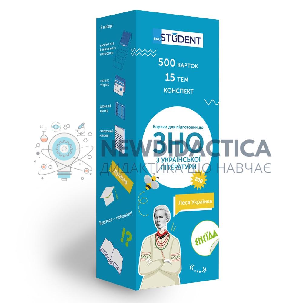 «ЗНО. Українська література» — набір для підготовки до тестування ЗНО, створений відповідно до програми, рекомендованої МОН України. Найважливіша інформація з курсу української літератури вміщена на картках. Набір допоможе запам'ятати час та місце розвитку подій у творах, псевдоніми письменників, особливості стилів літератури та інше. Додатковим бонусом до карток є е-конспект, у якому детальніше розкриті теми, винесені на ЗНО, розписані цитатні характеристики героїв, біографії авторів та викладені паспорти творів. 5 причин обрати картки від English Student: Вивчай! Особливості української літератури Запам’ятовуй! 95% інформації методом інтервальних повторень Розвивай! Пам’ять за допомогою регулярного повторення Використовуй! Разом із конспектом для навчання Перевіряй! Картками знання учнів або абітурієнтів До набору входить: • 500 карток з особливостями української літератури • коробка для навчання методом інтервальних повторень. Цей метод допомагає засвоїти понад 95% інформації • дорожній футляр для зручного користування картками впродовж дня • електронний конспект Перелік тем: Теорія літератури Псевдоніми письменників Перифрази про письменників Факти з біографій Епіграфи та присвяти Час та місце дії у творах Вірші Літературні роди Стильові напрями, течії Літературні угрупування Цитати з творів Закохані пари та любовні трикутники Автор, твір і головні персонажі Цитати про письменників Жанр, тема — твір і автор