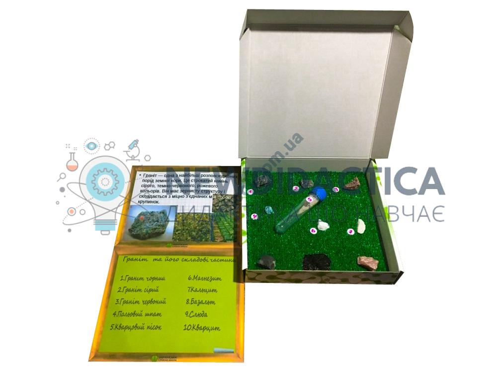 Категорія згідно переліку МОН: демонстраційне обладнання. Об’єкти натуральні. Колекції. Призначення: Обладнання для кабінету географії загальноосвітнього навчального закладу. Опис: колекція містить зразки об’єктів із супровідним описом (переліком). Кількість - не менше 8-ми натуральних зразків. Склад колекції: - граніт чорний - 1 од.; - граніт сірий - 1 од.; - граніт червоний - 1 од.; - польовий шпат - 1 од.; - кварцовий пісок - 1 од.; - магнезит - 1 од.; - кальцит -1 од.; - базальт -1 од.; - слюда - 1 од.; - кварцит - 1 од.; - паспорт на виріб - 1 од.