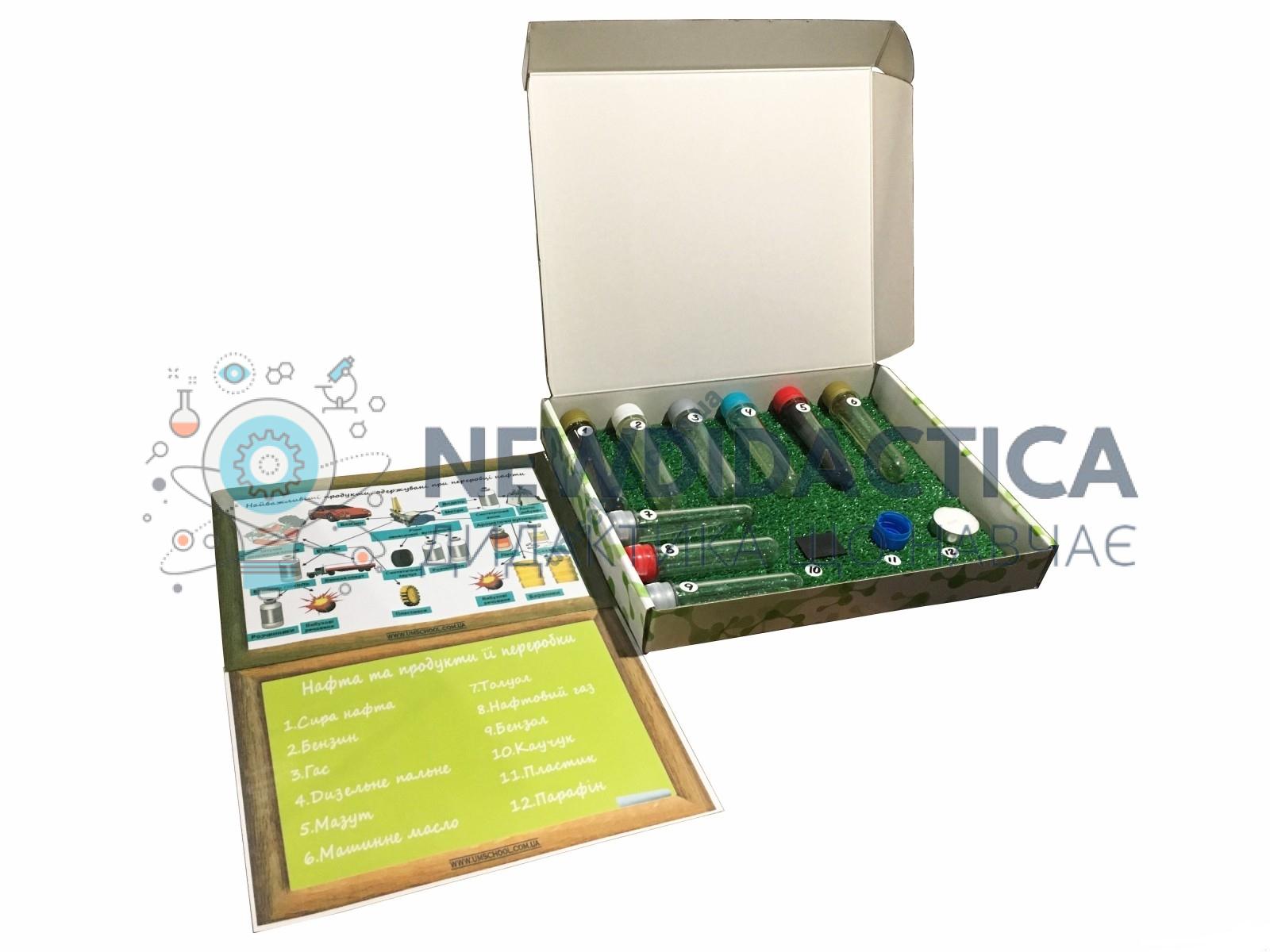 Категорія згідно переліку МОН: демонстраційне обладнання. Об’єкти натуральні. Призначення: для використання в загальноосвітніх навчальних закладах на уроках хімії, географії та природознавства як демонстраційного обладнання при вивчені відповідних тем. Колекція містить супровідний опис (перелік), зразки сирої нафти і продукти її крекінгу: бензол, толуол, озокерит, церезин, нафтовий газ, петролейний ефір, бензин, лігроїн, гас, газойль і соляр, вазелін і парафін, каучук, пластмаса та продукти переробки мазуту: солярове, веретенне, машинне, циліндрове масла, гудрон, крекінг гас і крекінг бензин. Зразки містяться у скляних колбах. Кількість - не менше 12 зразків об’єктів .