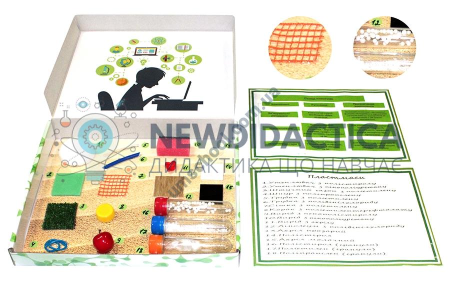 Навчальний посібник використовується в якості демонстраційного і роздаткового матеріалу. Колекція містить: поліетилен поліпропілен полістирол пінополістирол, поліамід полікарбонат, а також вироби з наведених пластмас. Зразки сировини - 6шт Зразки виробів з представленої сировини 6шт Пакування : коробка з ламінованого картону 35*28*6 см