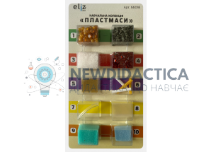 Колекція надає можливість ознайомитись з різними видами пластмас та виробами з них, що широко використовуються у промисловості. Колекція містить 10 натуральних колекційних зразків. Кожен зразок пронумерований та розташований в індивідуальній ячейці загальної блістерної упаковки. На зворотній стороні колекції міститься експлікація з назвами кожного колекційного зразка. Габаритні розміри 100х190х15мм. Вага 0,02кг.
