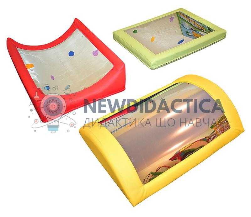 Акрилові безпечні дзеркала в ігровій формі сприяють розвитку комунікативних навичок, навичок імітації, формуванню цілісного сприймання себе, свого тіла. Зігнуті дзеркала розвивають уяву дитини, спонукають її до активного пізнання і спостереження за навколишнім середовищем. Набір складається з трьох модулів з різними за формою дзеркалами – увігнуте, опукле і пряме. Три елемента складаються в один – куб. Проблематика: затримка психічного розвитку (ЗПР), дитячий церебральний параліч (ДЦП), розумова відсталість (РВ), синдром дефіциту уваги і гіперактивність (СДУГ), мінімальна мозкова дисфункція (ММД), порушення зору, порушення слуху, мовні порушення, розлад аутистичності спектра. Терапія: терапія сенсорної інтеграції, ЛФК, фізкультурна терапія 3С, корекція нейропсихологічна, ігрова терапія, Флортайм, Томатіс терапія. Матеріал: шкірозамінник, еластичний пінополіуретан (поролон), акрил. Габаритні розміри в упаковці: 800 х 600 х 400 мм, вага – 8 кг. Продукція відповідає: ТУ У 32.2-37758787-002:2014 Технічному регламенту безпеки іграшок EN 71 (частини 1, 2, 3, 8) ДСТУ 2030 сертифікати.