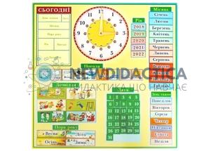 Магнітний календар використовується в якості демонстраційного матеріалу  в початкових класах.  Стрілки годинника – рухомі. Виготовлений з нетоксичного високоякісного пластику. Всі деталі на магнітній основі (74 од.)