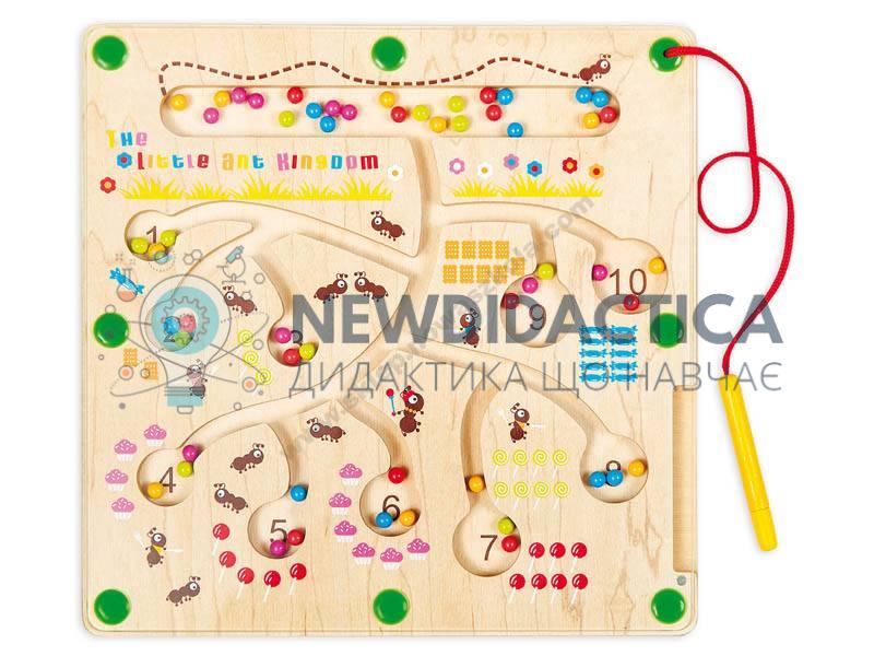 Математичний лабіринт, що показує мурах у мурашнику.Тунелі прорізані в плоскій дерев'яній пластині, вкритій оргскловою пластиною, яка запобігає випаданню та загубленню кольорових куль.Кожен тунель закінчується відповідною цифрою від 1 до 10 та малюнком однакової кількості слів певного кольору.До кожної лунки, використовуючи магнітну ручку на нитці, слід підвести кількість кольорових кульок, як зазначено на малюнку та кресленні, узгоджуючи колір куль з кольором, в якому було намальовано малюнок солодощів. тьмяний29,5 х 29,5 х 1,6 см