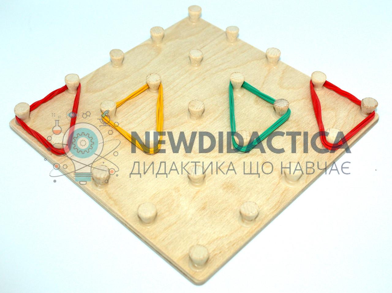 Використовується як роздатковий матеріал під час вивчення математики в початкових класах. Сприяє розвитку у дитини математичного мислення, дрібної моторики, засвоєння поняття геометричних фігур, розвитку уяви. Технічні характеристики: Виготовлено з деревини. Кількість контактів: 5х5. Габаритні розміри не менше 210х210мм. В комплект мають входити гумки для використання компленту, не менше 10шт.
