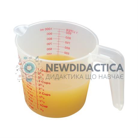 Мірний стакан зі шкалою 1 л незамінний на практичних заняттях у школі. Він із великою зручною ручкою, виконаний із напівпрозорого матеріалу, має кілька шкал обсягу і носик для зливання. Призначений для дітей від 5 років і старше. Мірний посуд використовується в якості лабораторного інвентарю на уроках хімії та біології для приготування складних розчинів. Також його застосовують на уроках праці на заняттях із кулінарії. Мірний стакан серії Education із чіткими поділками і написами на шкалі контрастного кольору. Виготовлений із міцного сертифікованого пластику.
