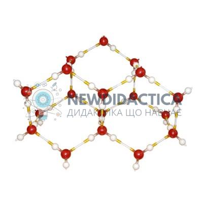 Призначена для демонстрування молекулярної  структури кристалічної гратки льоду. Склад:                                                                                                                            червоні та біді (меншого діаметру) пластикові кульки;    пластикові (металеві) стержні - "зв'язки" різної  довжини;              підставка.                                                                            Діаметр моделі атома: 20 мм.                                                  Розмір виробу:28,5 x 15 x 28,5 см.